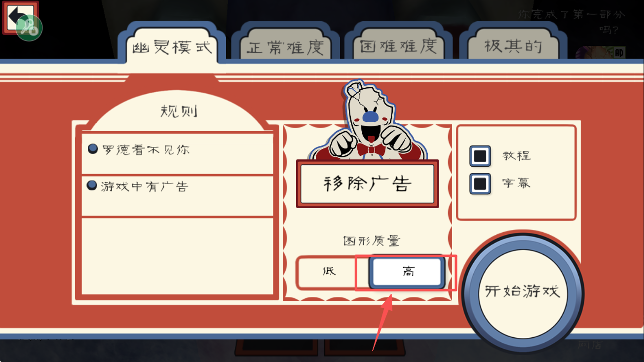 1、在游戏标题界面,点击“开始游戏”按钮,进入游戏,开始你的恐怖冒险之旅。