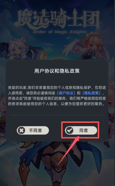 2、在用户协议界面,点击“同意”按钮,接受用户协议和隐私政策,继续游戏进程。