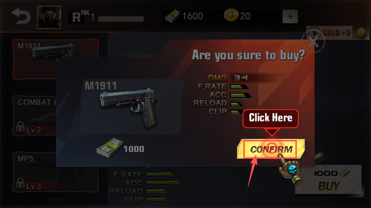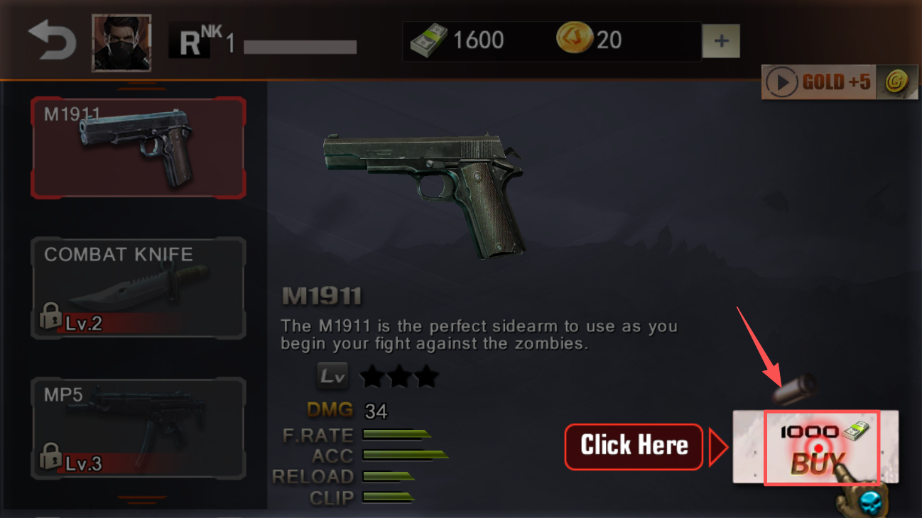 3、选择M1911手枪,点击“Click Here”进行购买。