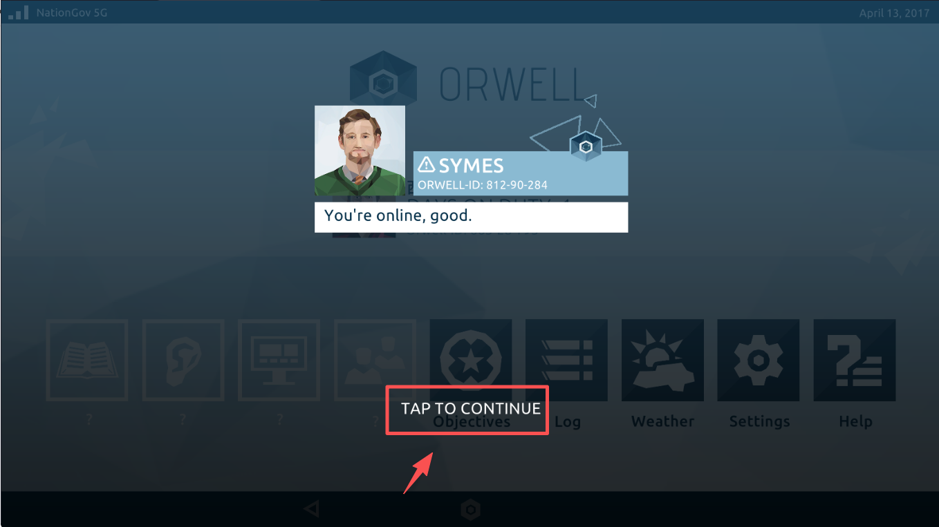 1、首先,点击“TAP TO CONTINUE Objectives”按钮,进入游戏主界面,开始你的调查任务。