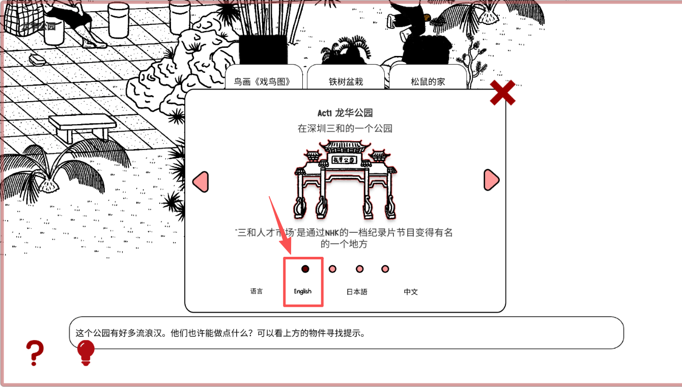 3、观察场景中的鸟画戏鸟图,点击获取线索,了解公园内隐藏的秘密。