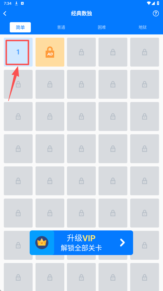 3、点击“1”选择关卡。选择简单难度的第一关,逐步熟悉游戏规则和玩法。