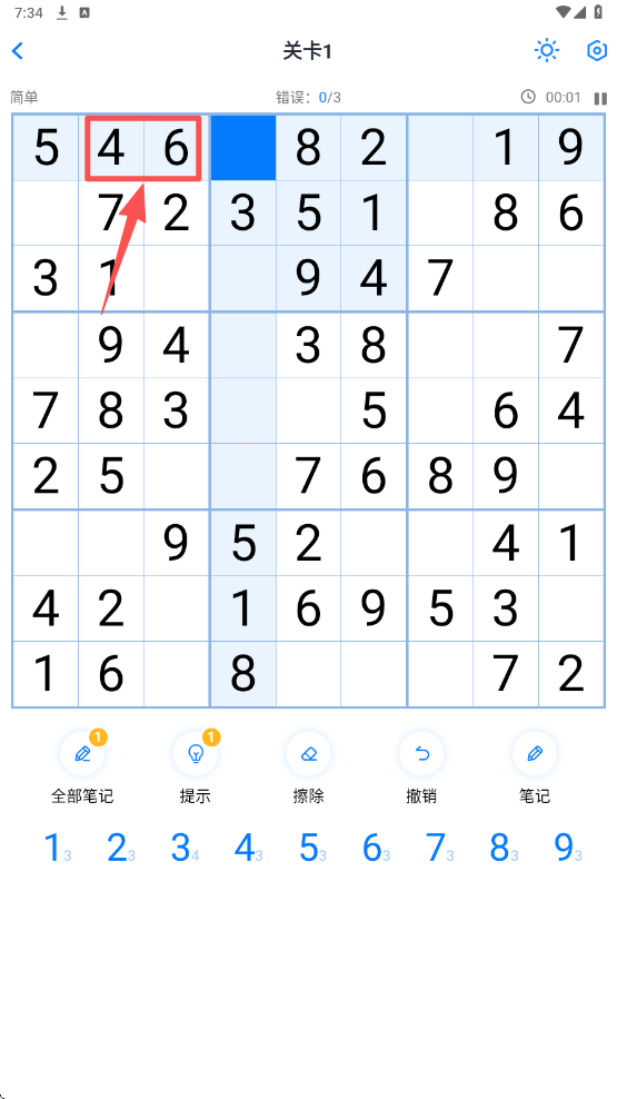 4、填写数字开始解题。根据数独规则,填入正确的数字,解开谜题库。