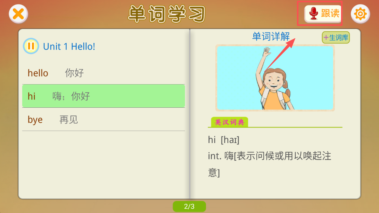 4、点击跟读练习发音。使用跟读功能,练习并纠正发音。