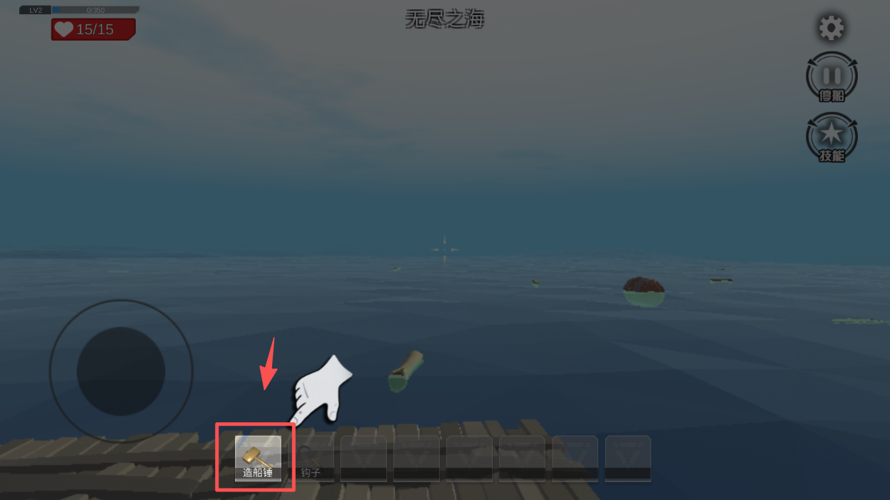 2、选择“造船锤”开始建造。点击造船锤,开始收集资源建造船只。