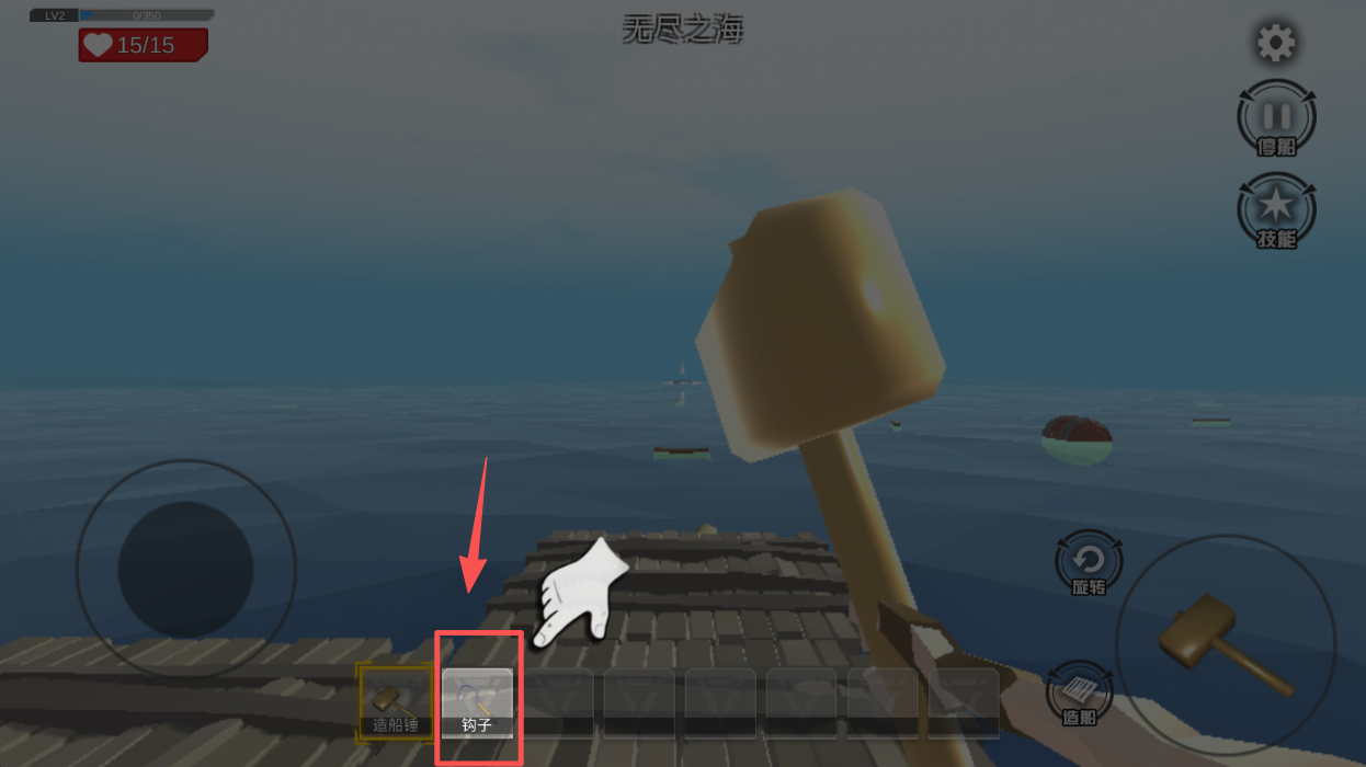 4、点击“钩子”进行钓鱼。选择钩子,尝试钓鱼获取食物和资源。