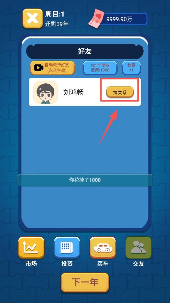 4、点击“搞关系”按钮互动。在交友界面选择好友,点击搞关系进行互动。