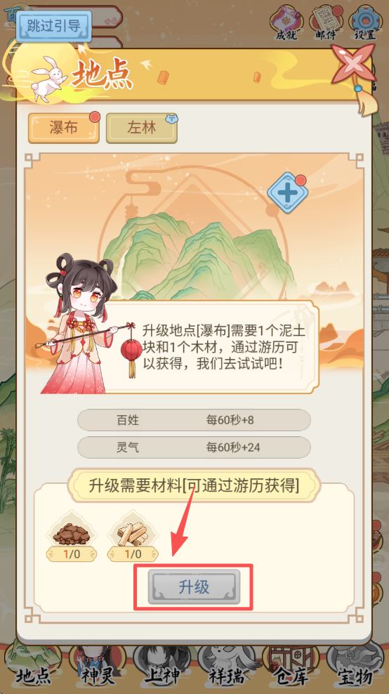 2、点击“升级”按钮提升地点等级。在地点界面中,点击升级来增强地点效果。