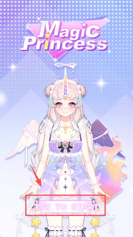 1、点击“TAP TO START”按钮,进入游戏,开始你的魔法公主装扮之旅。