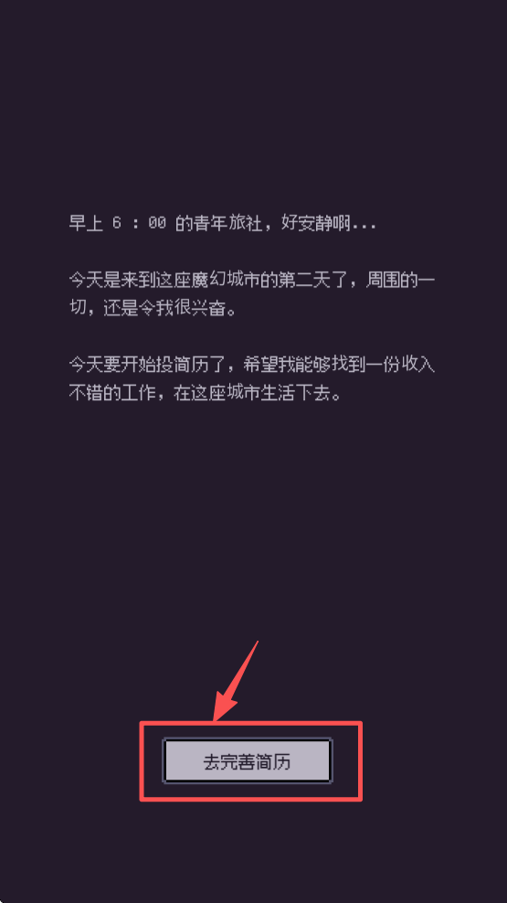 2、阅读游戏背景故事,了解你的角色和目标,然后点击“去完善简历”按钮。