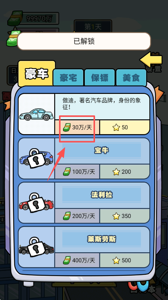3、在豪车选项中,选择并点击“宝牛”解锁并购买你的第一辆豪车。