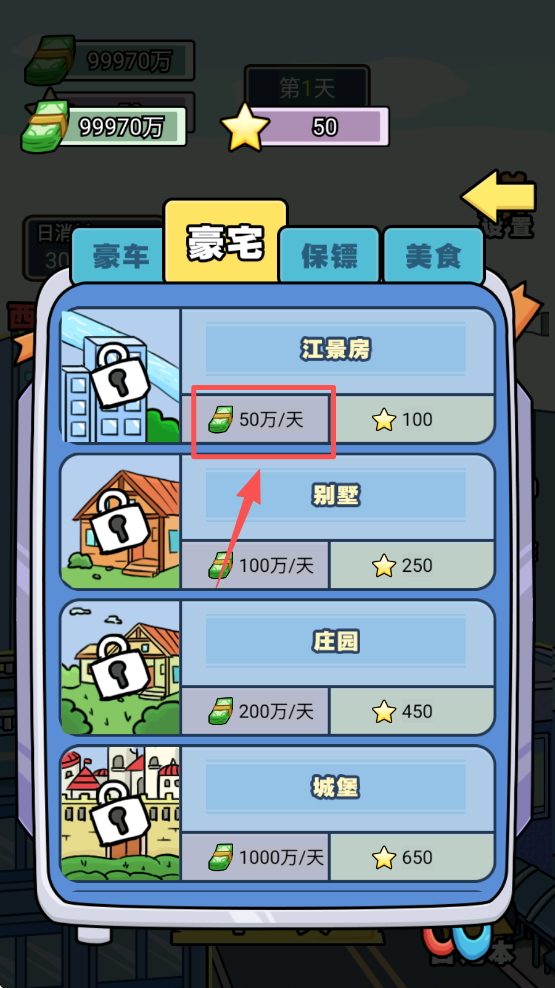 4、在豪宅选项中,选择并点击“别墅”解锁并购买你的第一栋豪宅。