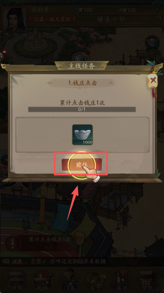3、根据任务提示,点击“钱庄”建筑,开始执行累计点击钱庄的任务。