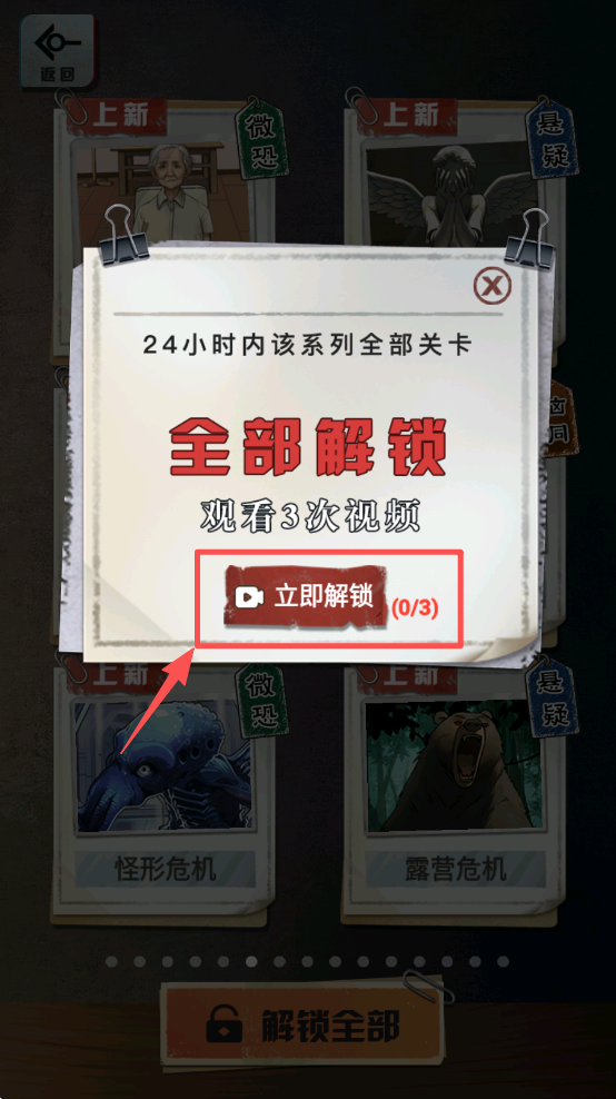 3、如果想解锁全部关卡,可以点击“立即解锁”按钮,观看视频后获取权限。