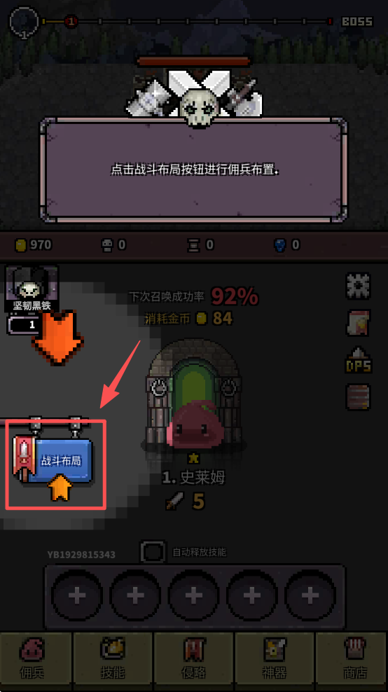 3、点击“战斗布局”按钮进行佣兵布置,合理安排佣兵位置以应对敌人。