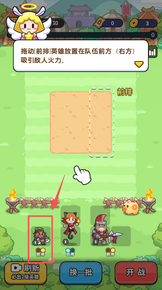2、拖动英雄到指定位置,如“前排”区域,以布置你的防御阵型。