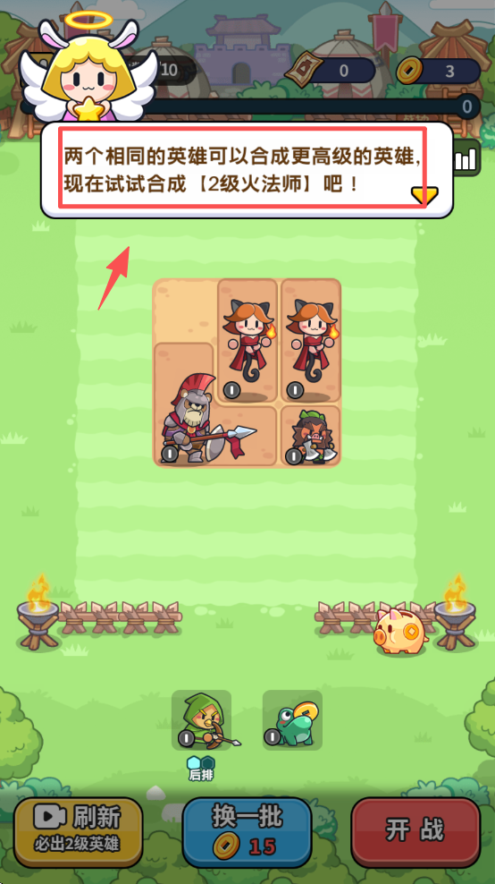 4、合成相同英雄以升级,例如合成两个相同的英雄获得更高级的火法师。