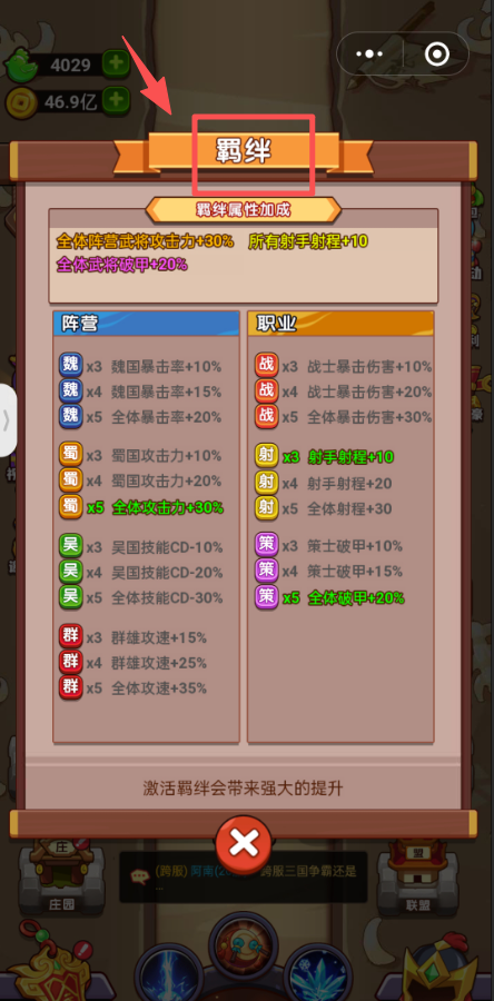 1、点击“羁绊”按钮,查看并激活角色羁绊,以提升全体阵营武将的攻击力和防御力。