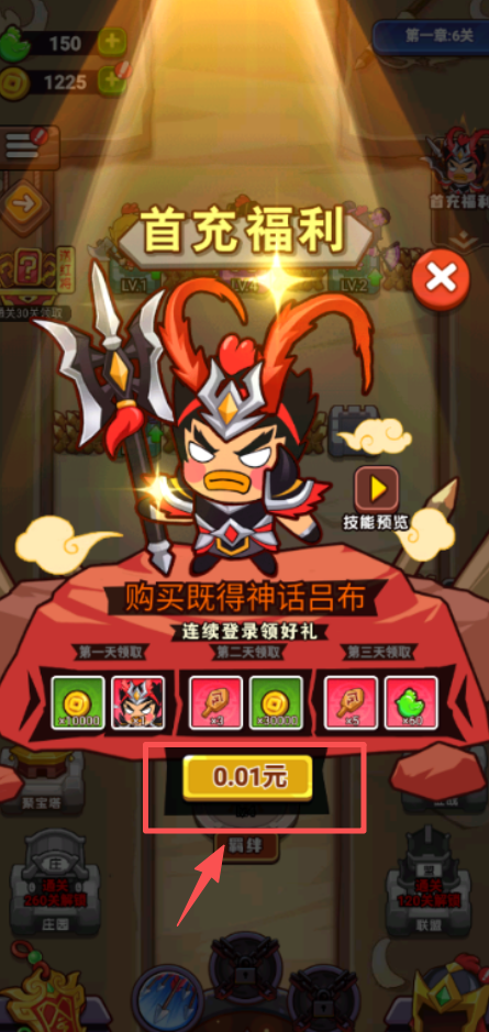 2、点击“首充福利”界面的“0.01元”按钮,进行首次充值,获取强力角色吕布。