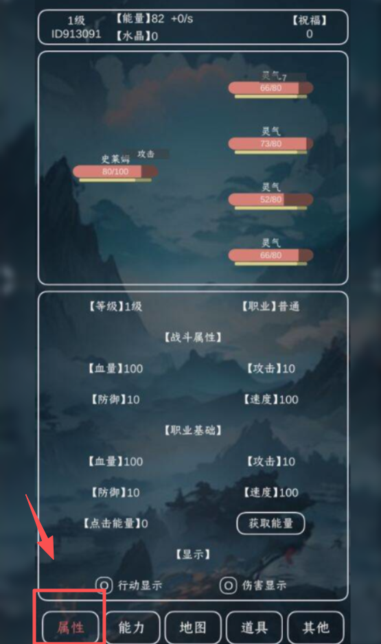 2、点击“属性”按钮,查看角色的详细属性,包括血量、攻击、防御和速度等。