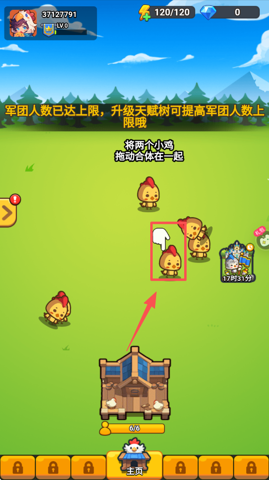 2、将两个小鸡拖动合体在一起,合成更高等级的小鸡,提升军团实力。