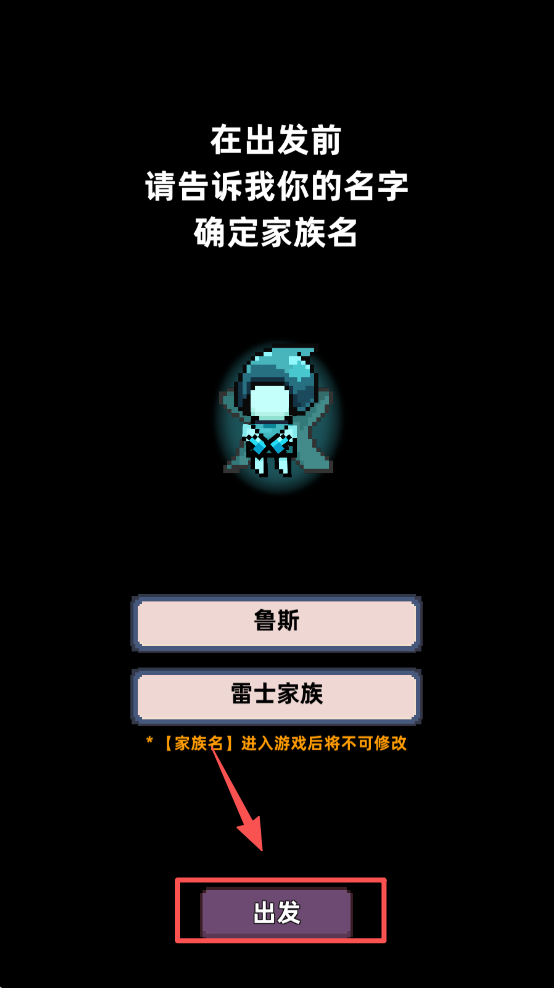 2、在出发前为你的角色设定名字和家族名,点击“出发”按钮进入游戏。