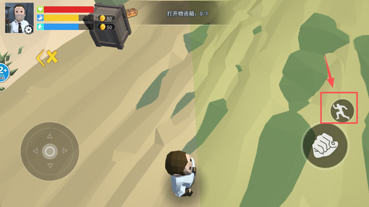 2、采集资源,接近物资箱,点击右侧“手”图标采集资源。