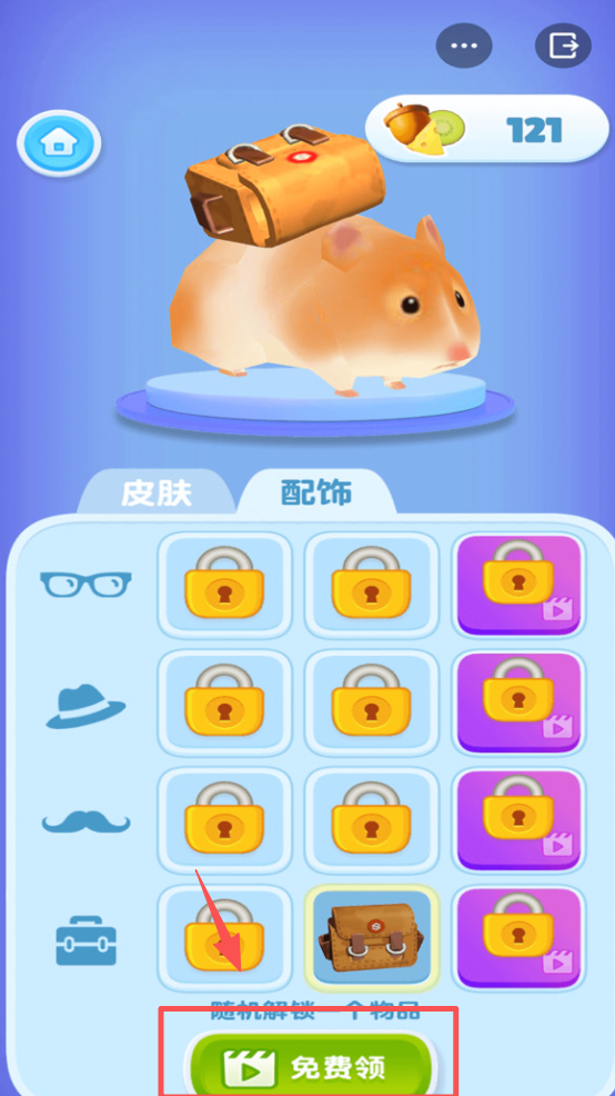 4、在游戏主界面,可以通过点击“免费领”按钮,随机解锁仓鼠的新皮肤或配饰。