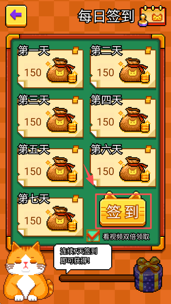 2、进入每日签到页面,找到标红的 “签到” 按钮点击,就能领取当日的 150 金币奖励。