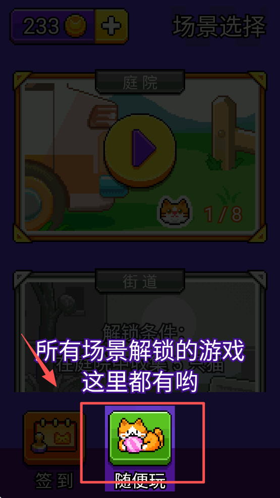 3、在场景选择界面,点击标红的 “随便玩” 按钮,就能进入所有解锁场景的游戏啦。
