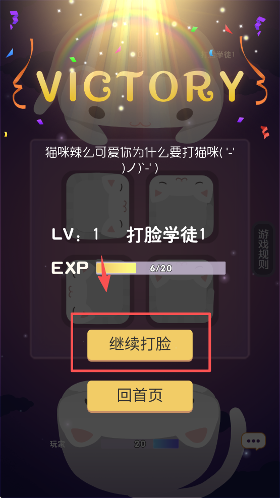 4、赢得对决后,点击“继续打脸”按钮,继续游戏,积累经验,提升等级。
