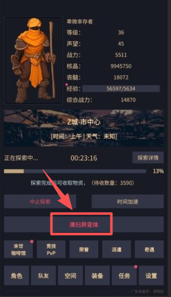 2、开始探索,点击“清扫异变体”按钮,开始在游戏中进行探索。