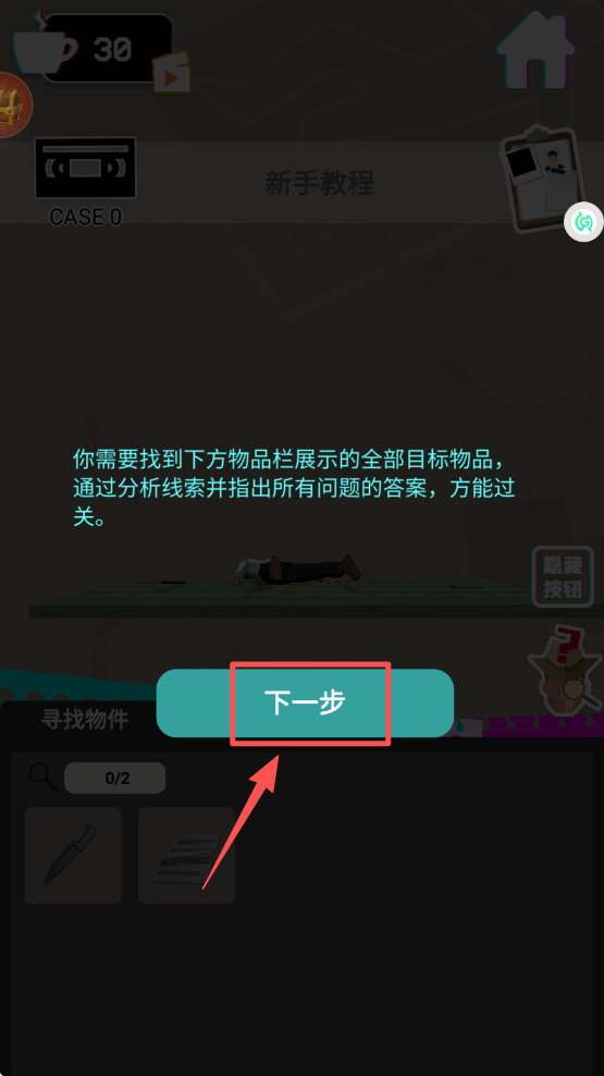 4、根据任务要求寻找并收集现场证据,例如刀具,完成收集后点击“下一步”继续游戏。