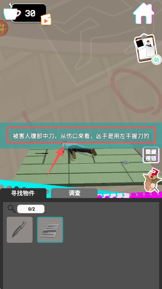 3、根据提示分析线索,例如“被害人腹部中刀,凶手用左手握刀”等,以确定调查方向。