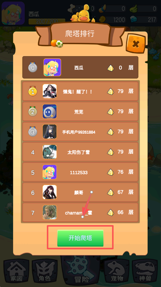 4、在爬塔排行界面,点击“开始爬塔”按钮,挑战自我,提升排名。