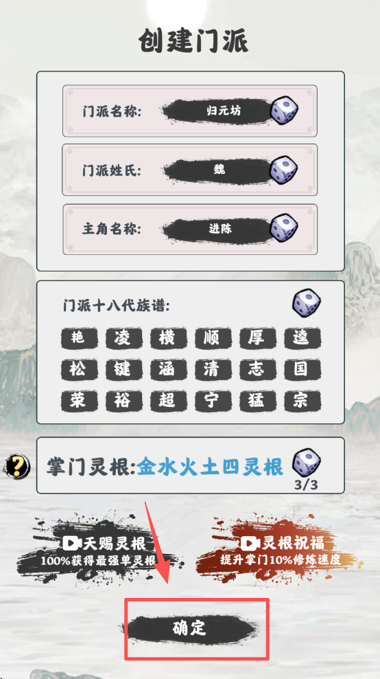 2、填写门派信息,包括名称、姓氏和主角名称,然后点击“确定”。