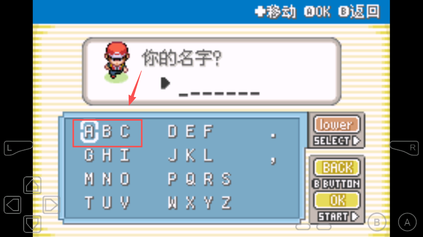 2、在名字输入界面,使用方向键选择字母并按A键确认。