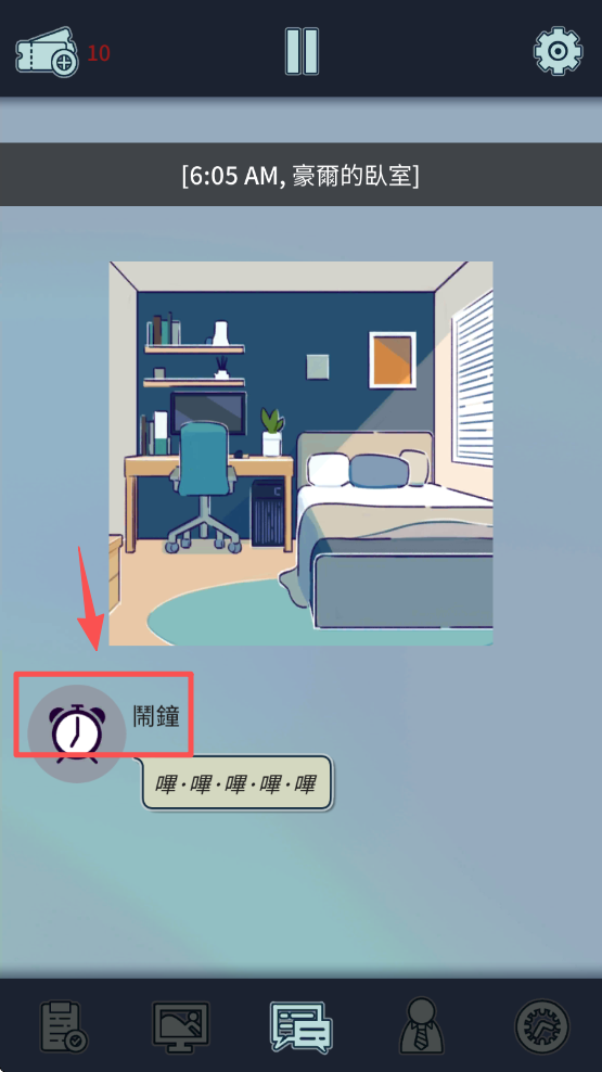 2、在游戏场景中,点击“闹钟”图标,关闭闹钟,继续游戏。