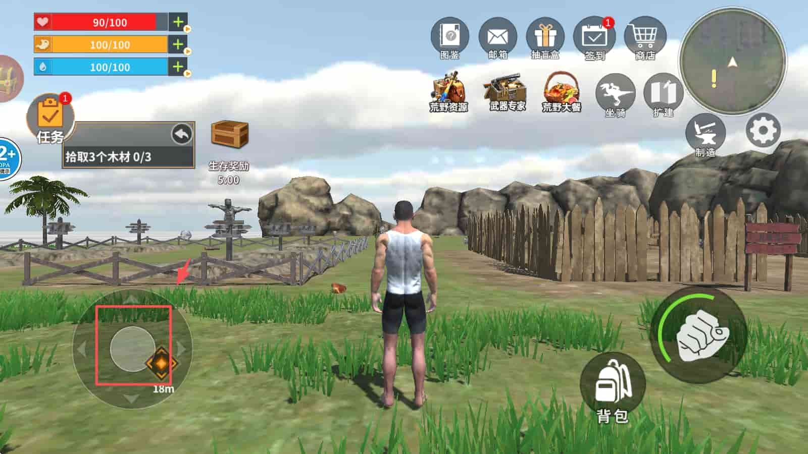 2、使用虚拟摇杆控制角色移动,寻找并收集资源,如木材,以完成任务。