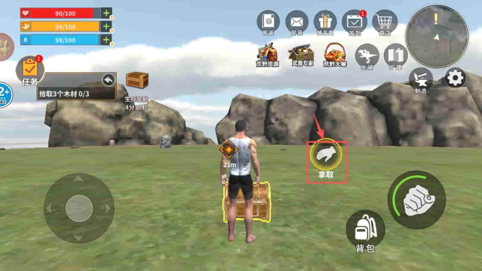 3、靠近资源点并点击“拿取”按钮,收集所需物品,为生存做准备。
