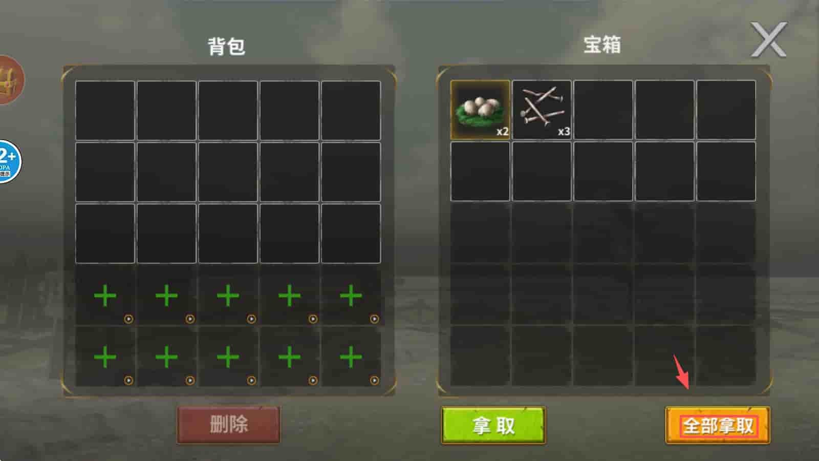 4、打开背包,点击“全部拿取”将宝箱中的物品转移到背包中。