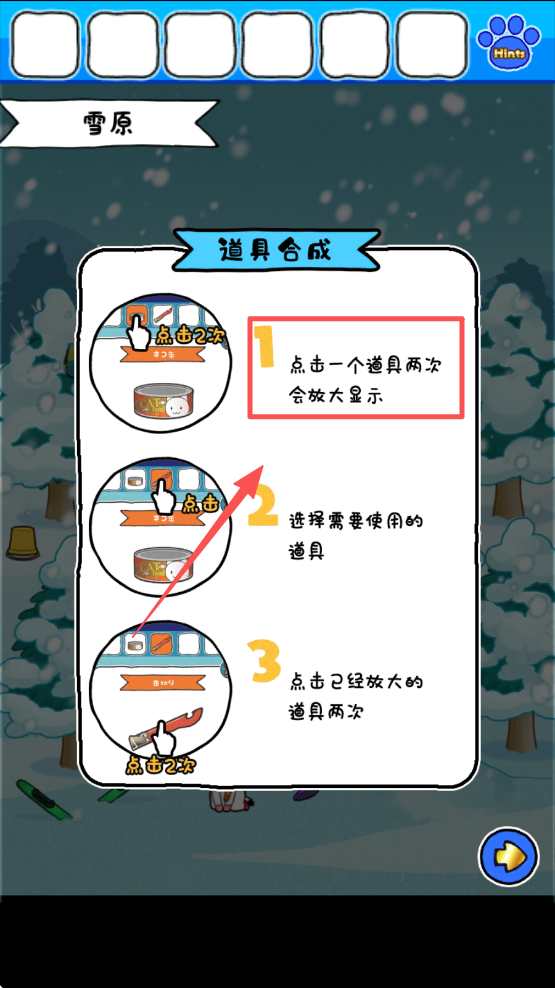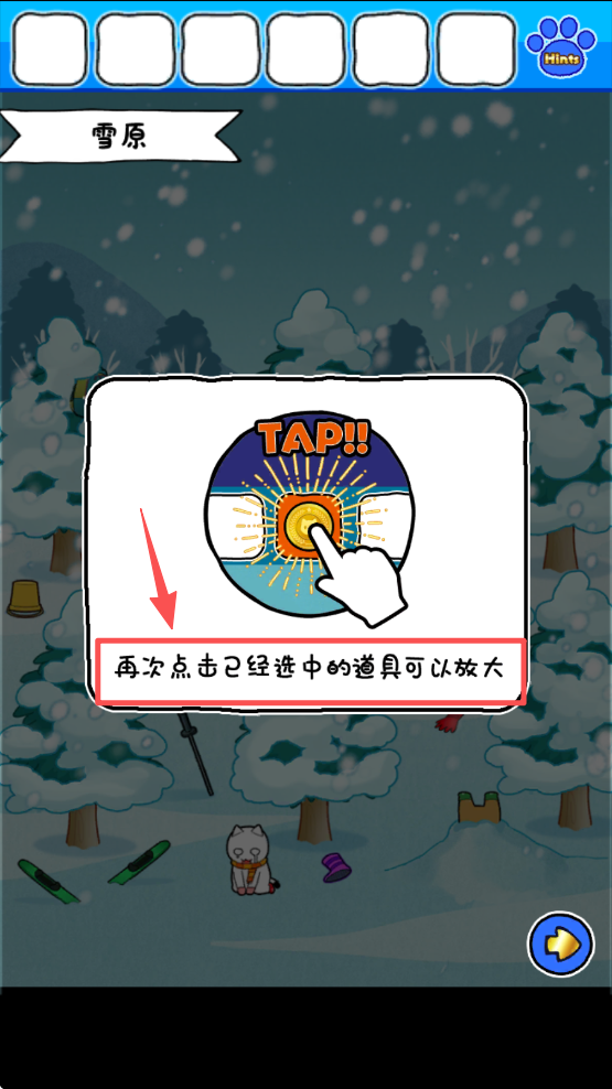 3、点击屏幕上的提示,学习如何使用道具,例如放大查看选中的道具。