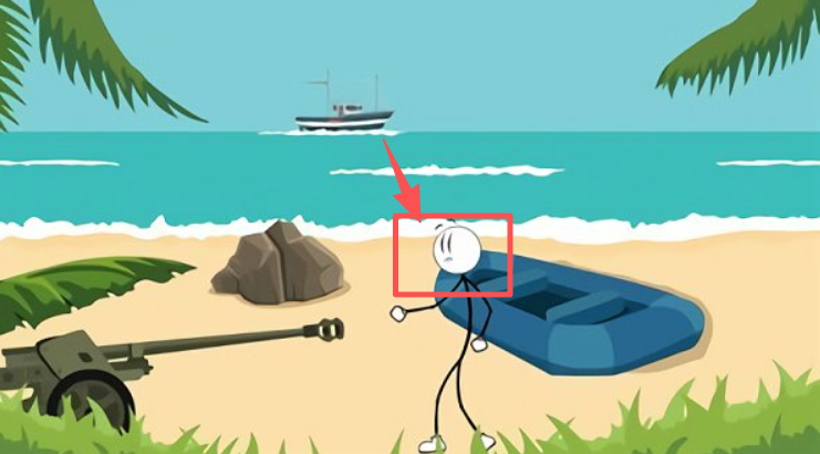 4、在海滩场景,点击充气艇,准备逃离孤岛,继续冒险。