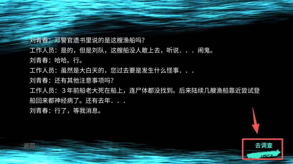 2、阅读案件背景对话后,点击 “去调查” 按钮,进入渔船相关的调查场景。