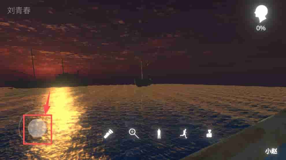 4、使用左侧的移动按钮,操控角色在海面区域移动,向目标渔船方向靠近。