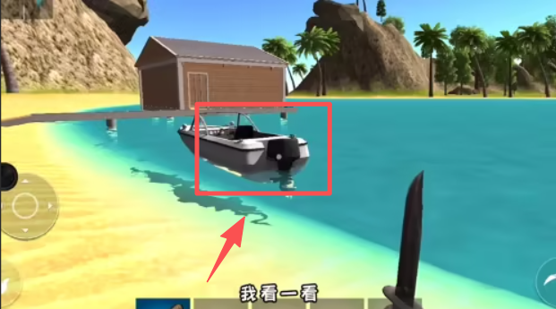 2、在海滩场景中,点击水面上的船只,触发 “我看一看” 的互动操作。