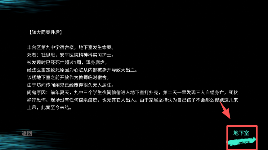 2、阅读案件背景,点击“地下室”按钮,了解案件详情。