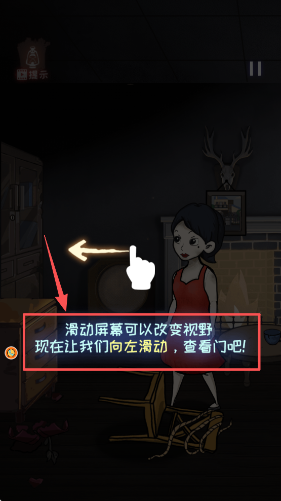 4、根据指引向左滑动屏幕切换视野,查看房间内的门以推进后续探索。