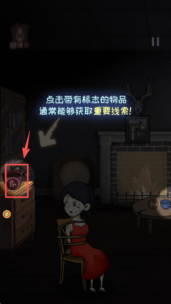 2、在房间场景中,点击红色框选的带标志物品,获取推进游戏的关键线索。