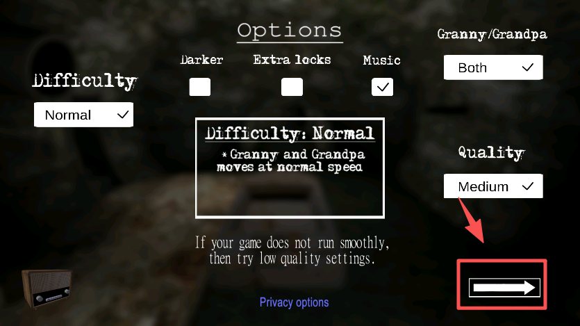 2、在设置界面确认难度等选项后,点击箭头按钮进入游戏实际场景。
